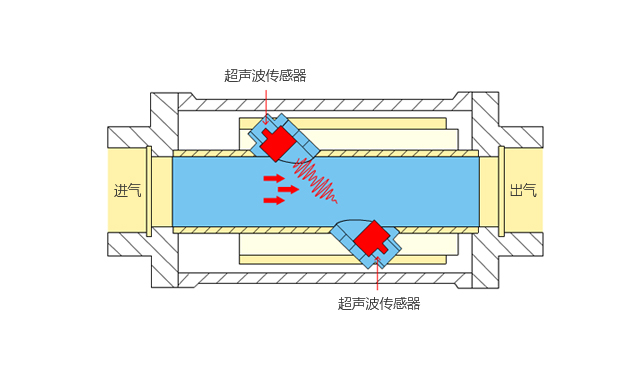 超聲波氣體傳感是根據(jù)超聲波傳播中聲速差的原理(又稱超聲波時差法)來計算氣體濃度和流速。超聲波在下游方向的傳播速度會增加,而在反方向的傳播速度會降低,通過一對超聲波換能器交替(或同時)發(fā)射和接收超聲波。通過觀察超聲波在介質(zhì)(氣體或液體)中上游和反向流動傳播時間的差異,間接測量流體速度,然后根據(jù)流體速度計算出流量數(shù)據(jù)。