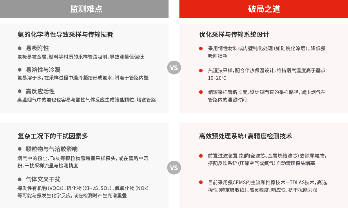 固定污染源氨逃逸在線監(jiān)測的核心難點(diǎn)源于氨自身的高水溶性、強(qiáng)吸附性與反應(yīng)活性,以及復(fù)雜惡劣的煙氣環(huán)境(高溫、高濕、高粉塵、酸性氣體共存)。這導(dǎo)致在樣品采集與傳輸過程中極易發(fā)生氨溶解于冷凝水、吸附于管路部件、或與酸性氣體反應(yīng)生成銨鹽而損失,造成測量值偏低和響應(yīng)延遲。同時,環(huán)保法規(guī)要求的ppm級超低濃度測量需求,對分析技術(shù)的靈敏度、選擇性和抗干擾能力提出了極高挑戰(zhàn)。